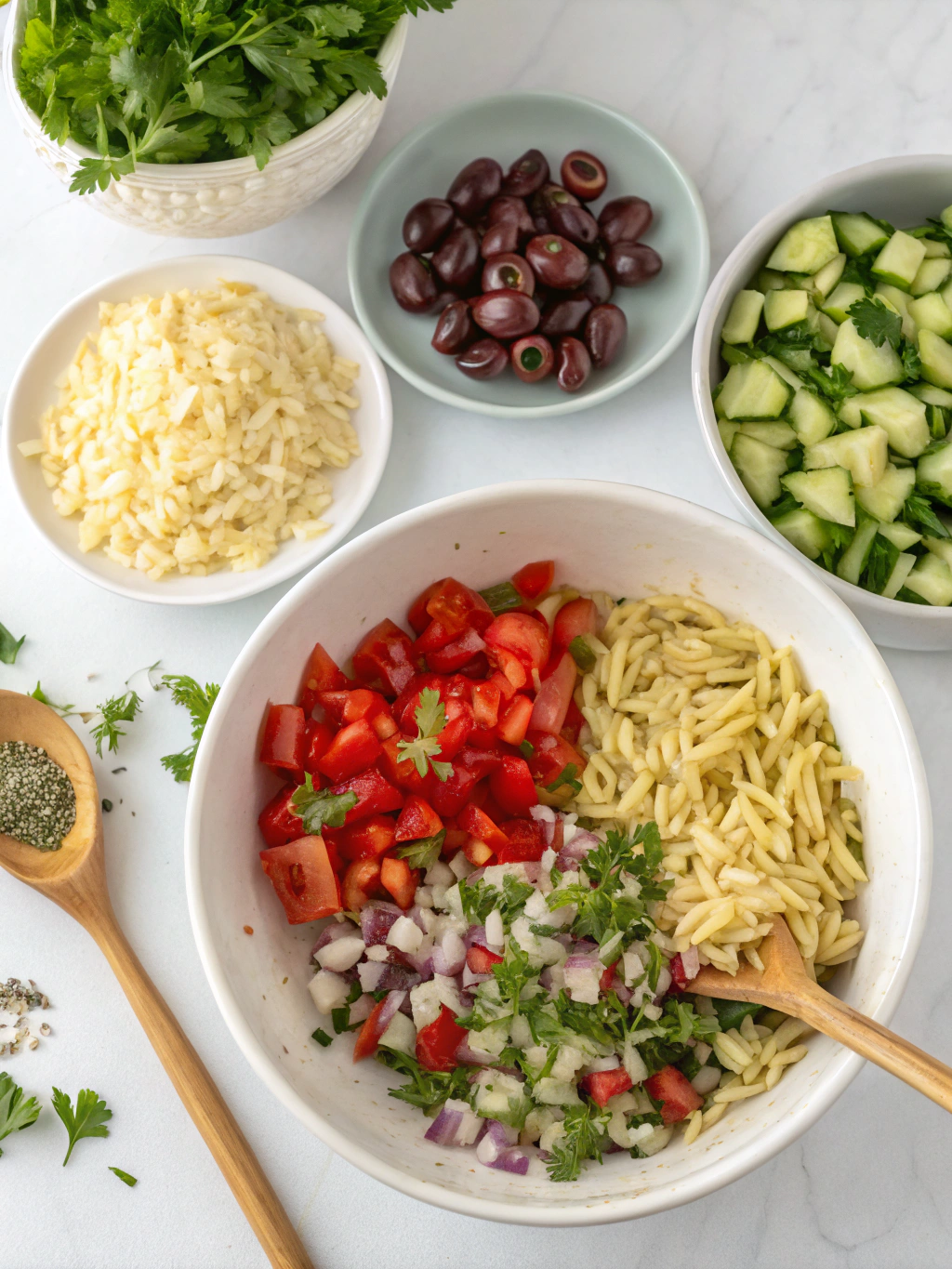 Orzo, Tomato, Cucumber & Olive Salad with Fresh Herbs – Light Mediterranean Meal